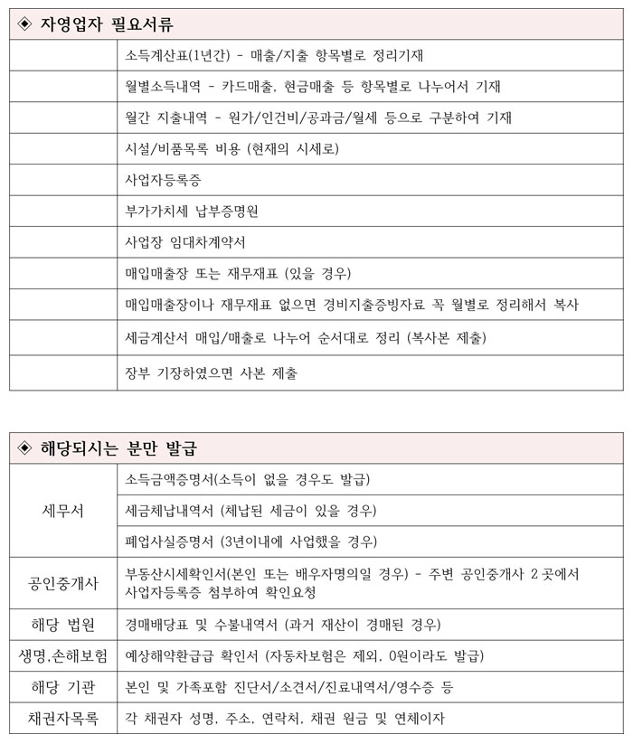 당사 내방상담 및 업무계약 체결 후 개인회생절차를 본격적으로 진행할 경우 준비해 주셔야 하는 서류를 안내합니다. 단, 개인별 상황에 따라 달라질 수 있으니 반드시 전문 변호사와 상담한 후에 준비해 주시기 바랍니다.