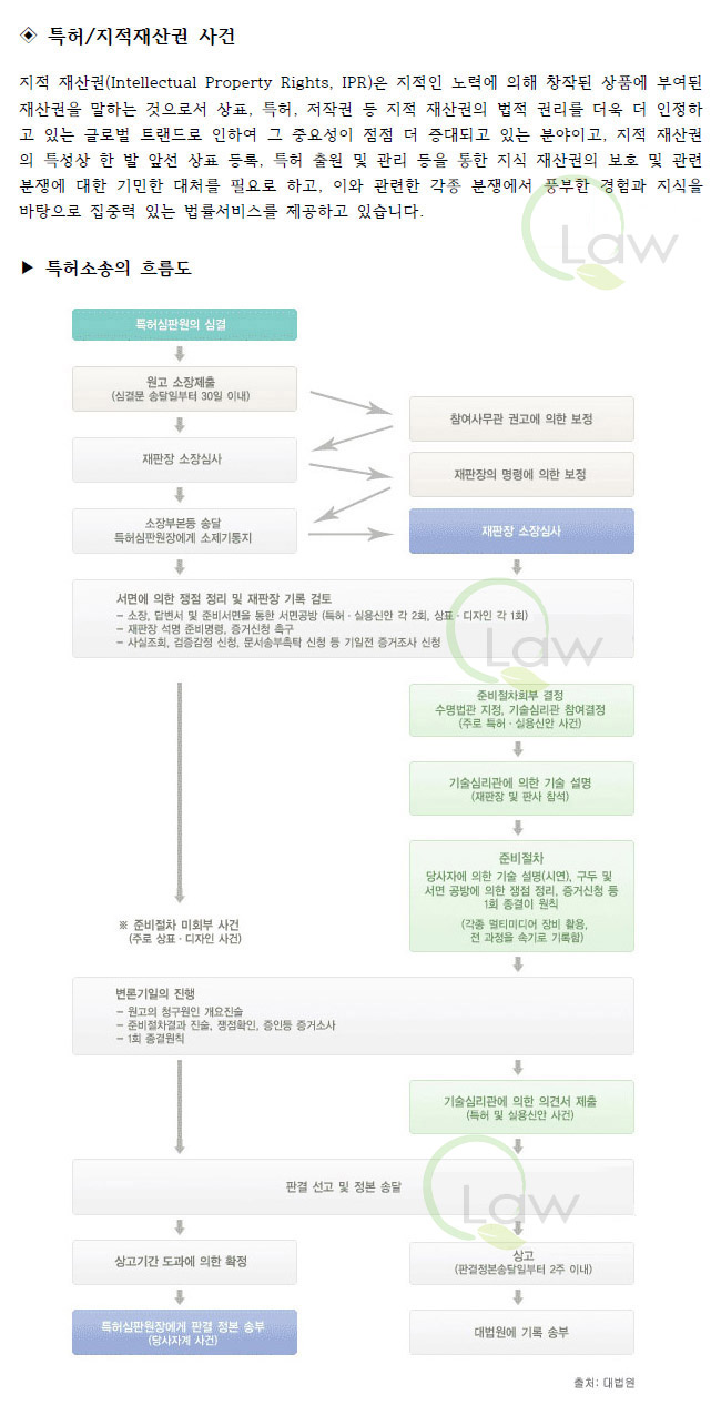 지적 재산권(Intellectual Property Rights, IPR)은 지적인 노력에 의해 창작된 상품에 부여된 재산권을 말하는 것으로서 상표, 특허, 저작권 등 지적 재산권의 법적 권리를 더욱 더 인정하고 있는 글로벌 트랜드로 인하여 그 중요성이 점점 더 증대되고 있는 분야이고, 지적 재산권의 특성상 한 발 앞선 상표 등록, 특허 출원 및 관리 등을 통한 지식 재산권의 보호 및 관련 분쟁에 대한 기민한 대처를 필요로 하고, 이와 관련한 각종 분쟁에서 풍부한 경험과 지식을 바탕으로 집중력 있는 법률서비스를 제공하고 있습니다.